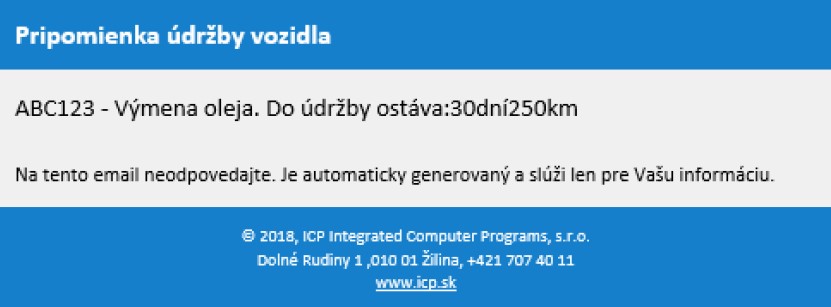 - V nastavenom časovom alebo km predstihu sa Vám program automaticky ozve - pošle Vám sms správu a zároveň informačný email, že je čas pripraviť konkrétnu údržbu na konkrétnom vozidle.